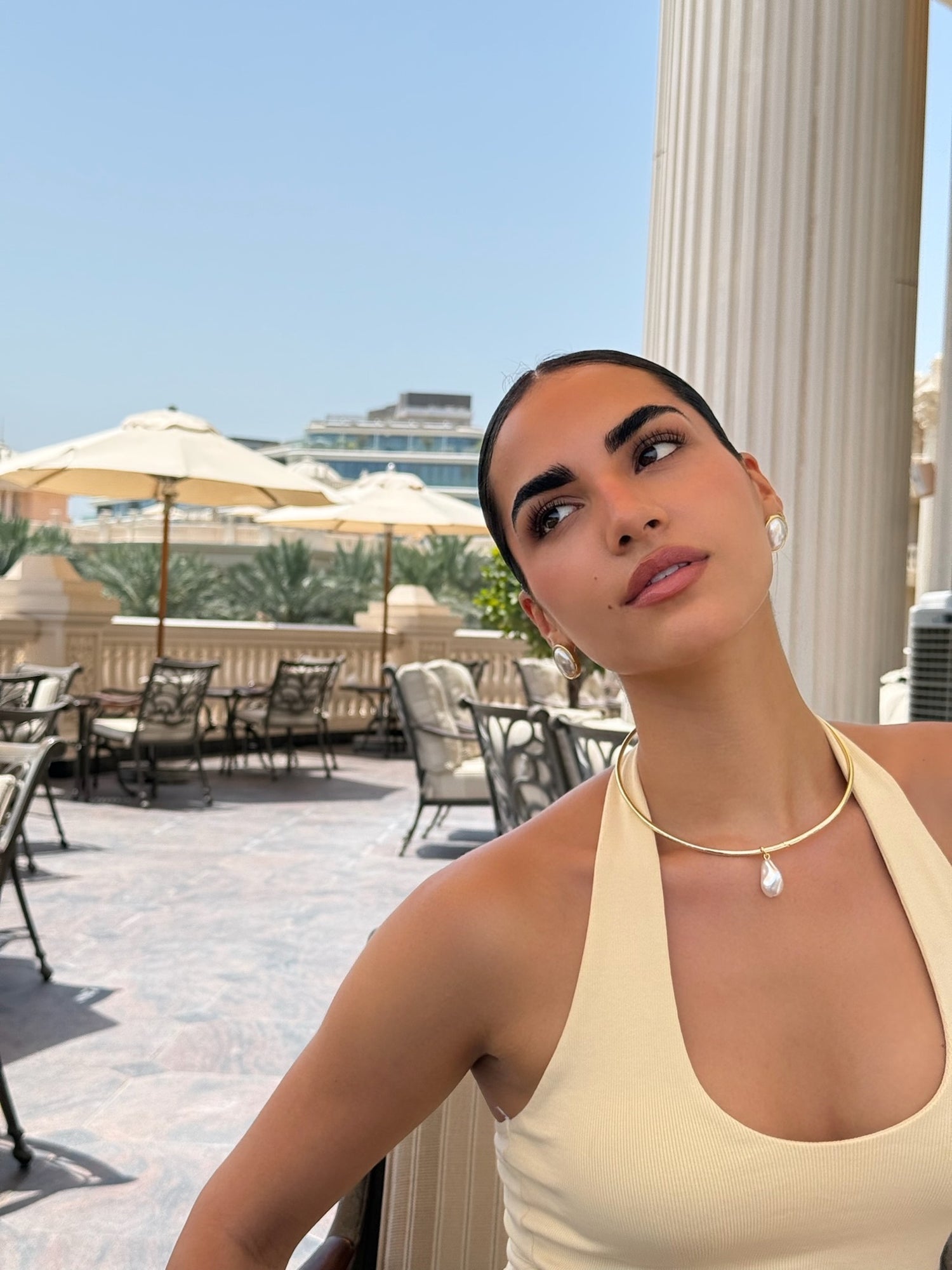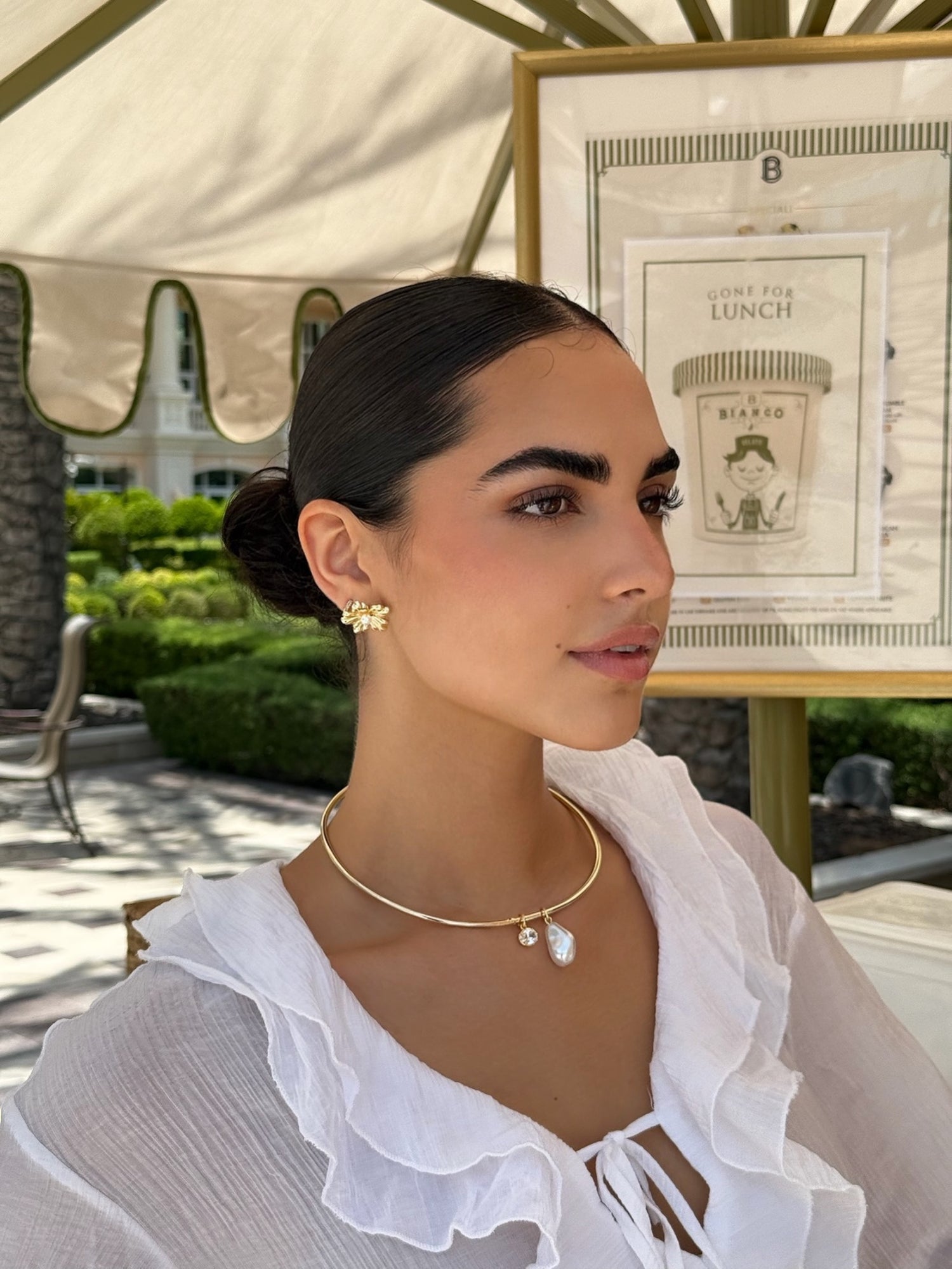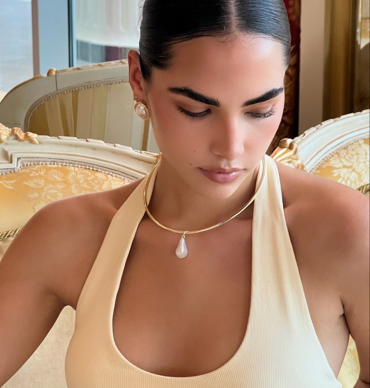A signature piece from our Palais Postcards collection, the Juliette necklace features a soft baroque pearl suspended from a polished 14k gold-plated choker. A modern heirloom designed for sunlit escapes and warm evening moments.