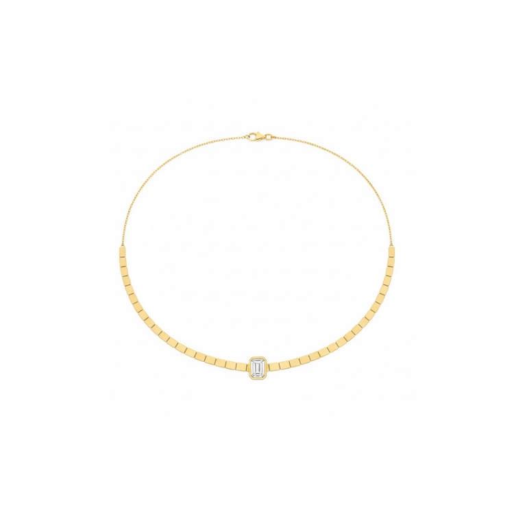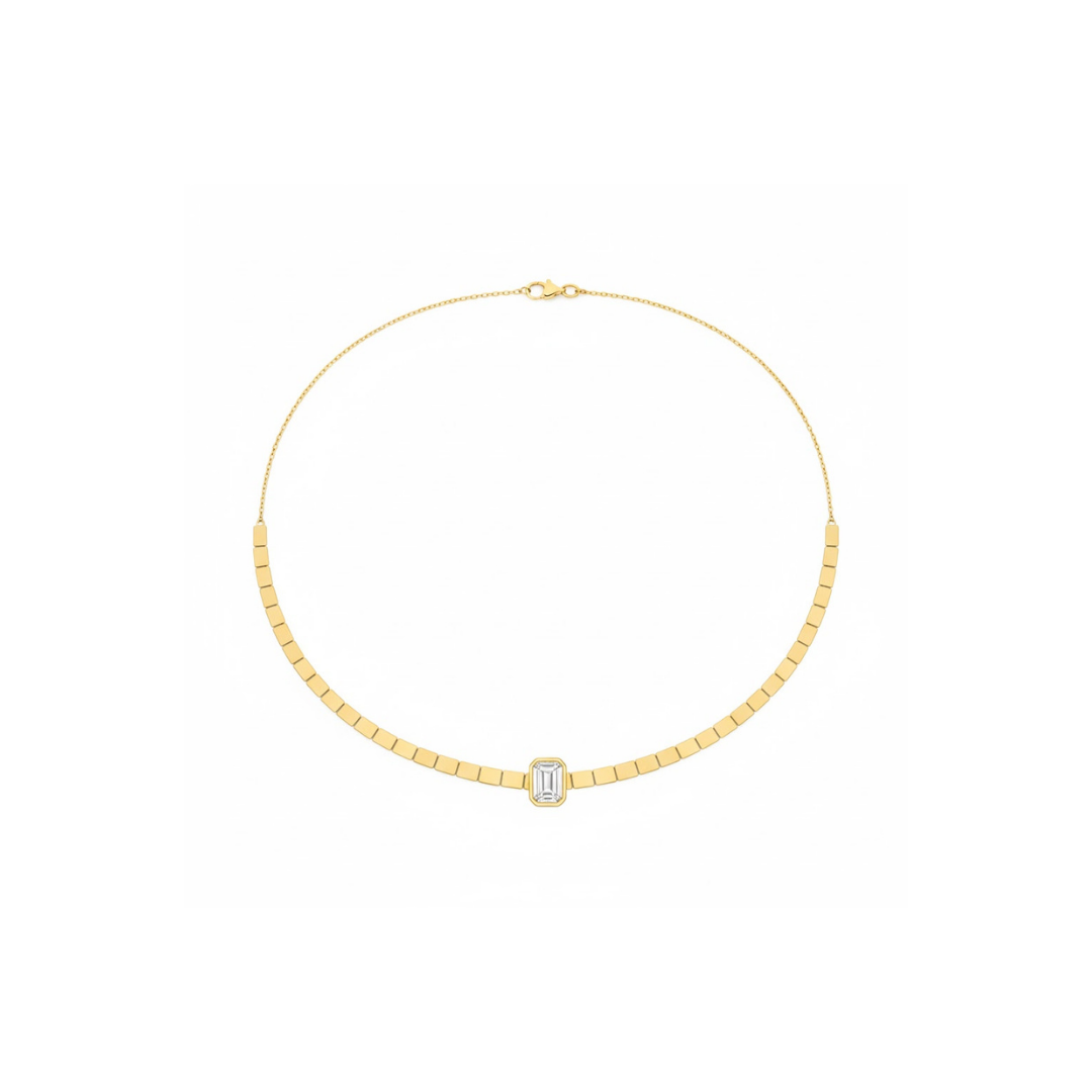 The Focus Necklace centres around a single radiant-cut stone, framed by a refined gold chain designed to sit close to the collarbone. Clean, precise, and intentional, it draws the eye inward, a quiet statement anchored in simplicity.